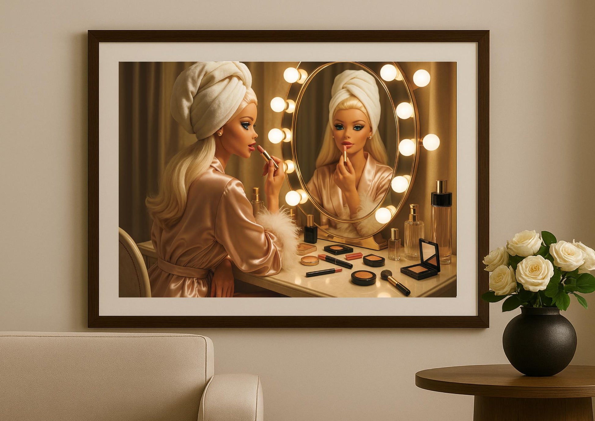 Bathed in the warm glow of vanity lights, this art print captures a quiet moment of self-admiration and timeless elegance. A glamorous figure, wrapped in satin and framed by a mirror lined with golden bulbs, evokes the nostalgic charm of mid-century Hollywood beauty rituals.