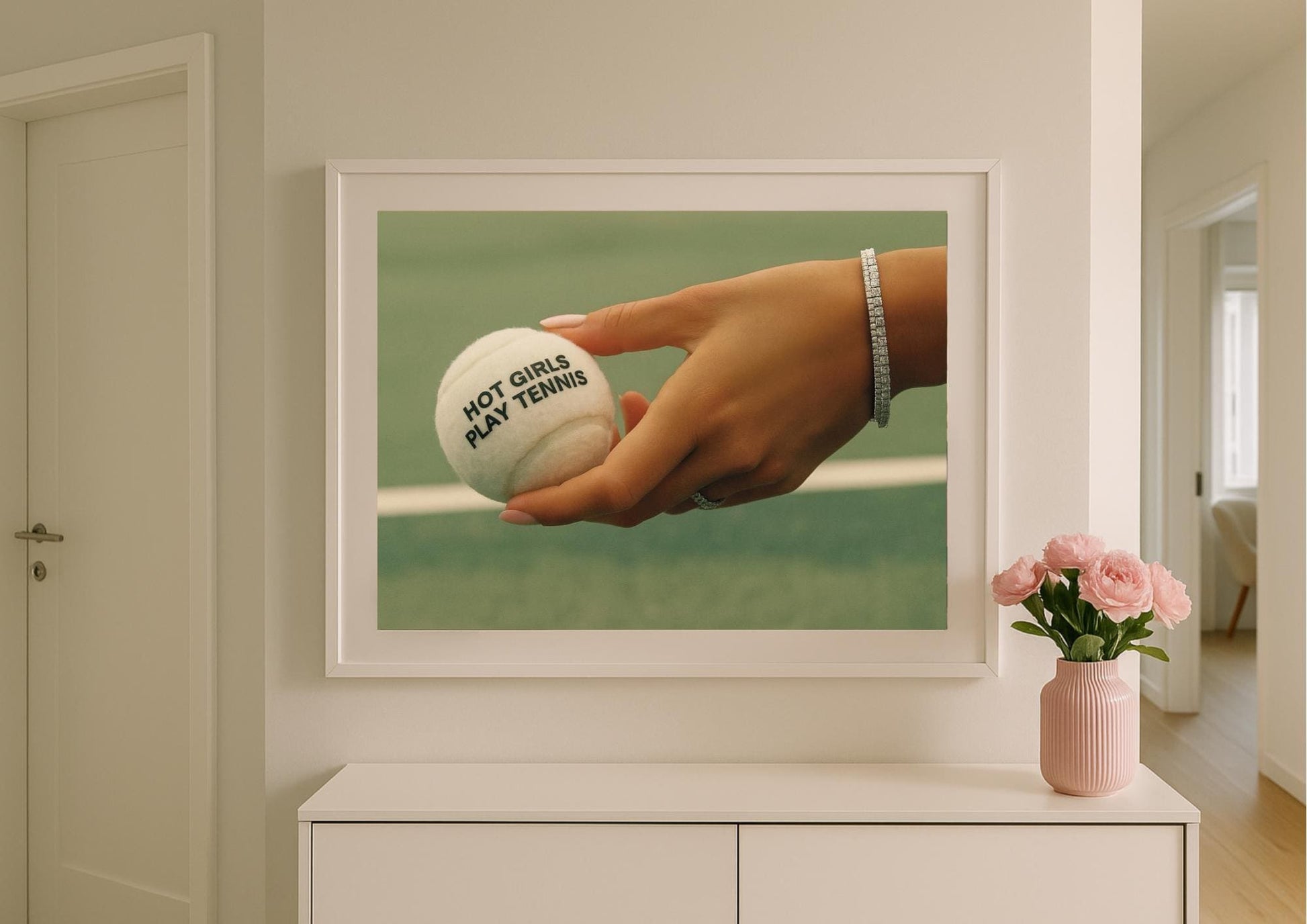 Add timeless glamour to your home with this fashion photography wall art, a retro-inspired print that celebrates elegance, diversity, and movement. Featuring a poised hand holding a tennis ball inscribed with the phrase "Hot Girls Play Tennis," this piece blends athletic attitude with modern femininity — a bold statement for those who embrace both style and strength.