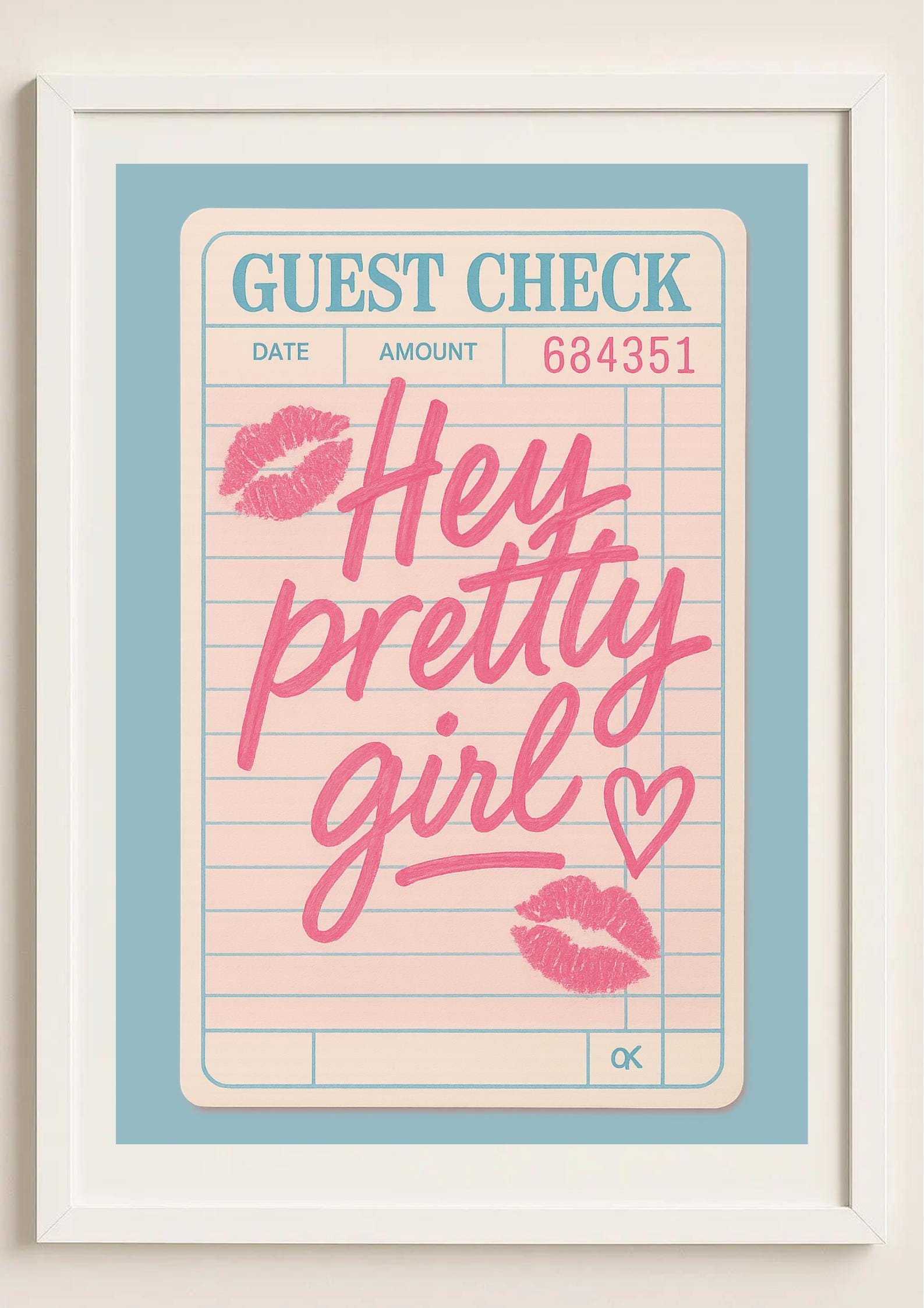 Soft, sweet, and full of charm — this pastel “Hey Pretty Girl” print blends retro diner nostalgia with a modern coquette twist. Featuring vintage-inspired typography, pink lipstick kisses, and a soothing blue border, it’s the perfect mix of playful and polished.