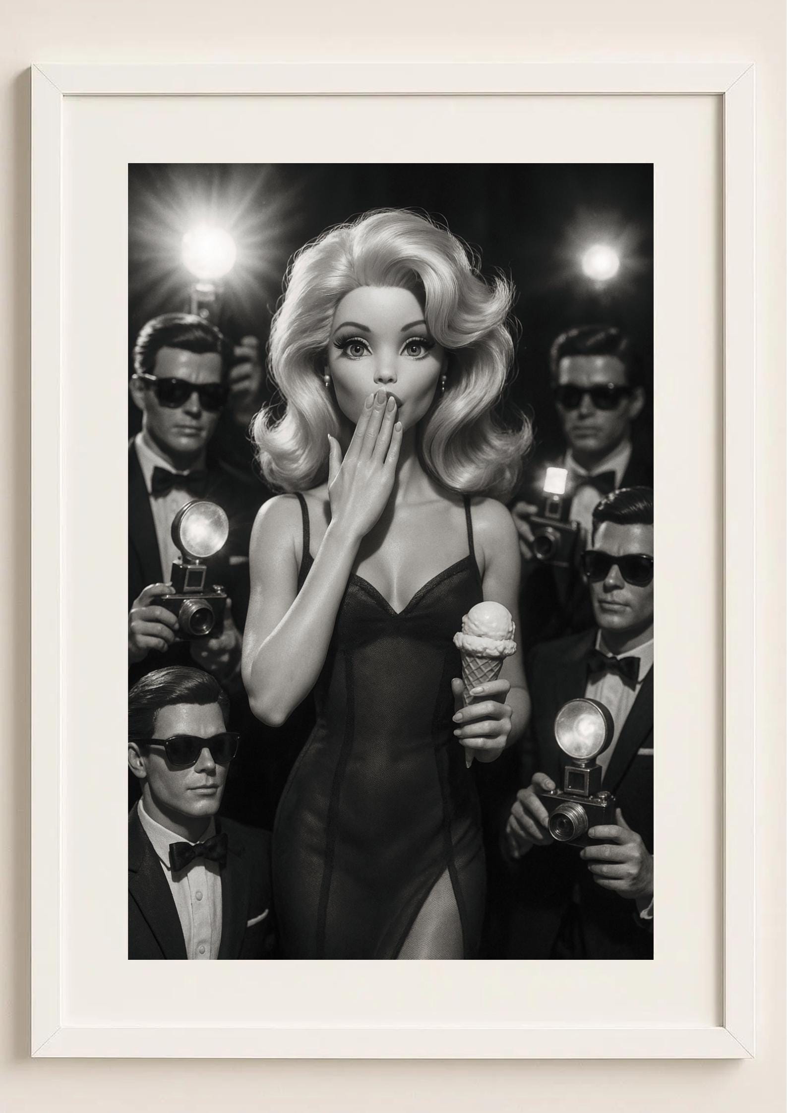 Dramatic, playful, and impossibly chic — this art print captures the thrill of old Hollywood through a modern lens. A luminous figure stands amid flashing cameras, her surprise immortalized in monochrome elegance. Shot in a cinematic noir style, it celebrates fame, performance, and the allure of the spotlight.