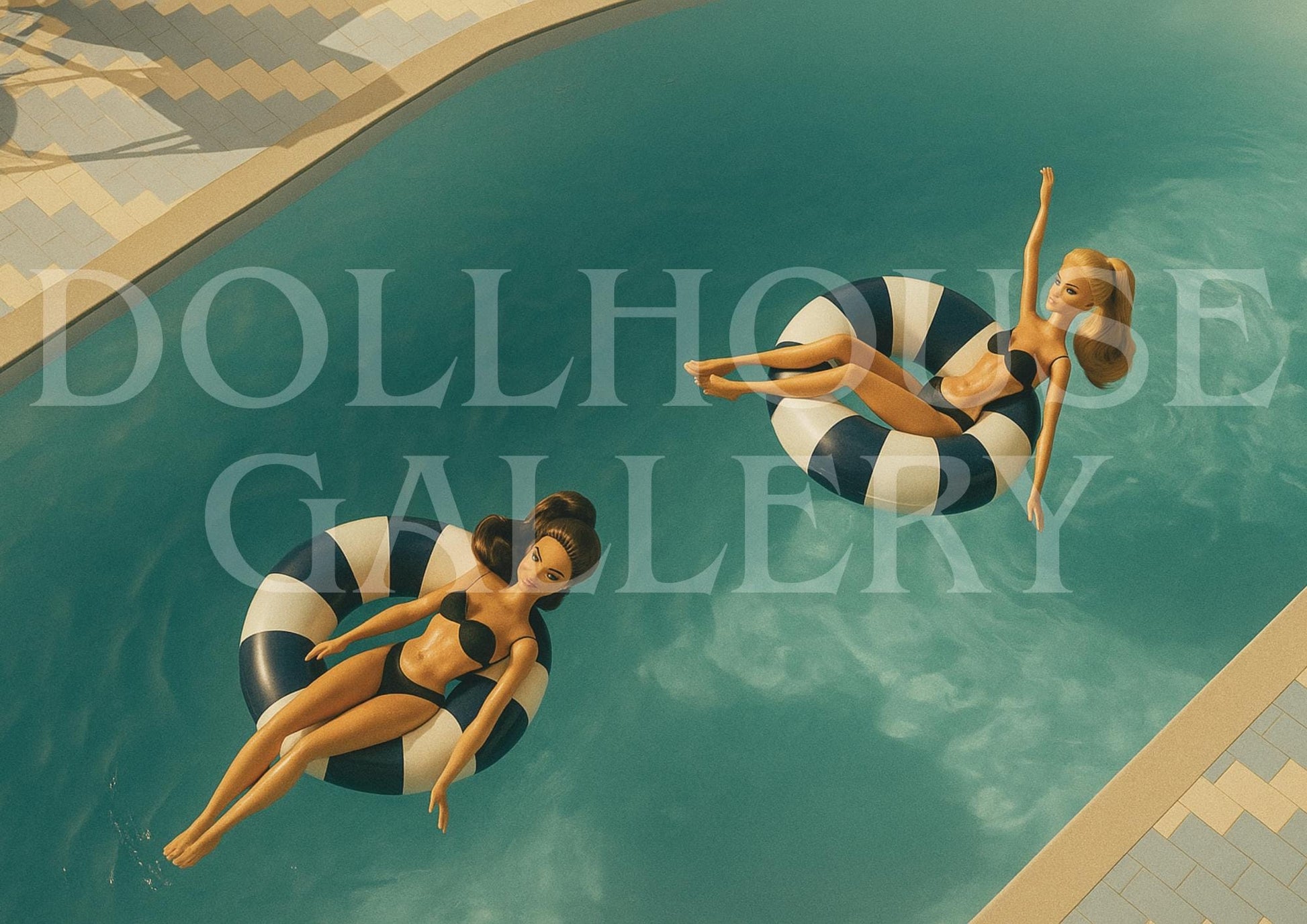 Effortlessly glamorous and sunlit with vintage charm — this Slim Aarons inspired art print captures the timeless beauty of poolside leisure. Featuring two women floating gracefully in striped rings beneath golden light, it evokes the relaxed sophistication of mid-century luxury living.