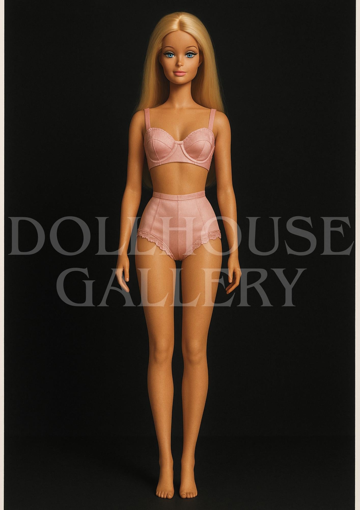 Elegant, understated, and timeless — this art print captures the quiet glamour of vintage studio portraiture. Featuring a figure in a soft pink ensemble against a deep black background, it evokes the sophistication of mid-century fashion photography while maintaining a clean, modern aesthetic.