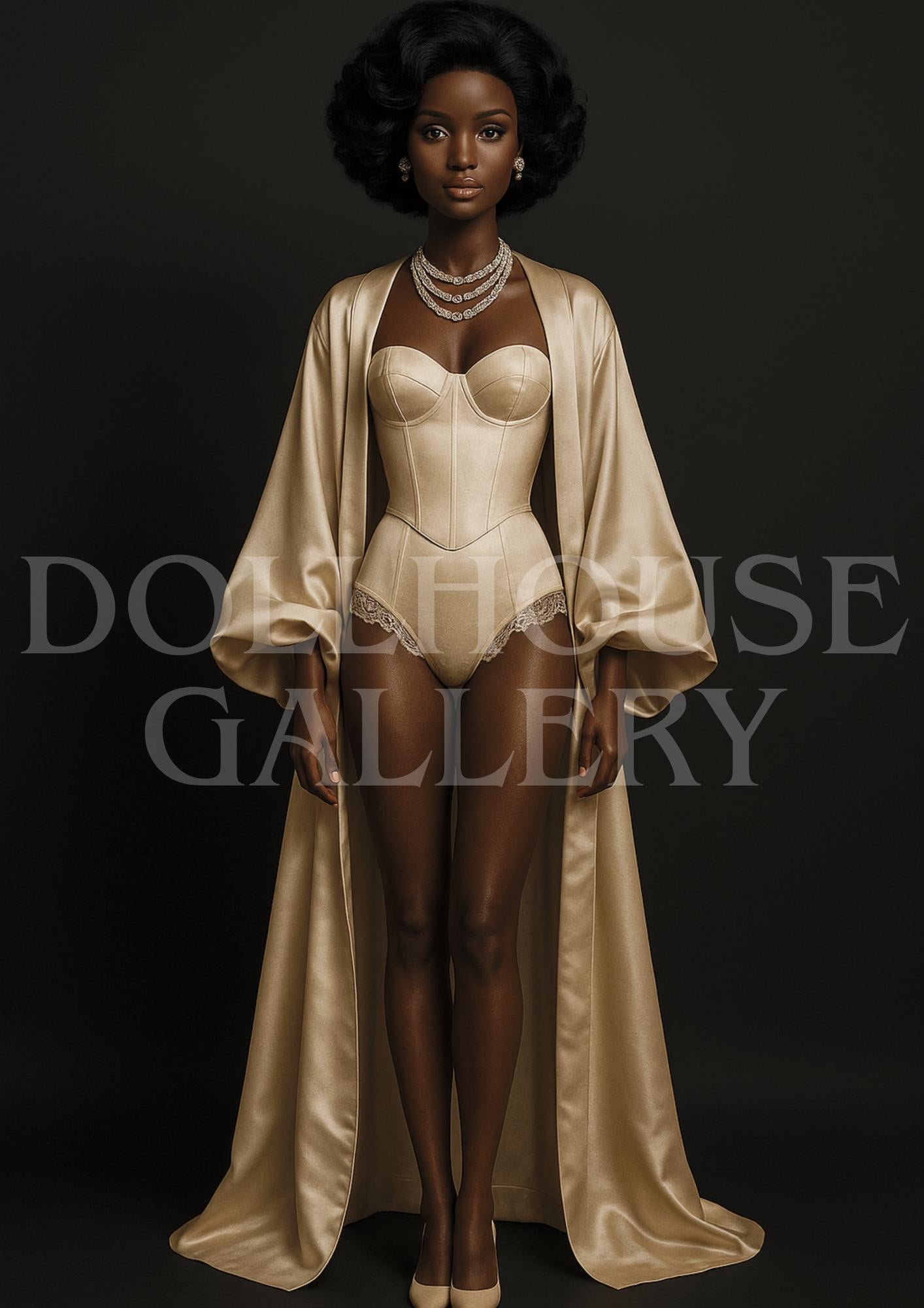 Radiant, regal, and timeless — this art print captures the essence of vintage elegance through a modern lens. Dressed in a golden satin robe and corset, the poised figure stands against a rich neutral backdrop, exuding grace, confidence, and cinematic glamour. Inspired by Slim Aarons’ refined eye for beauty and form, this portrait is both classic and contemporary — a statement of effortless sophistication.