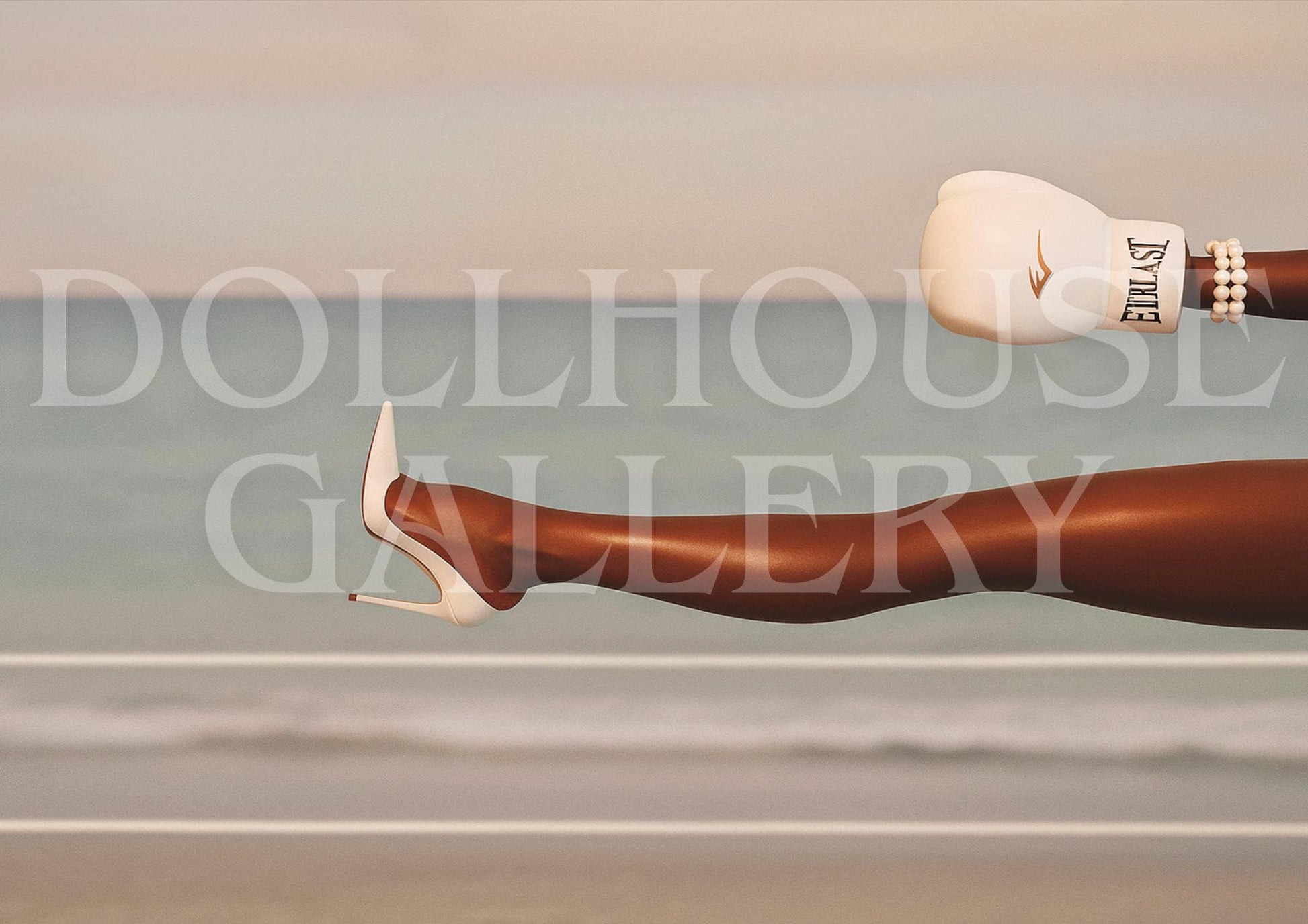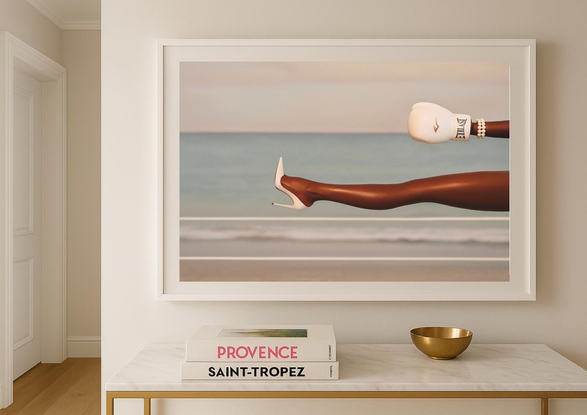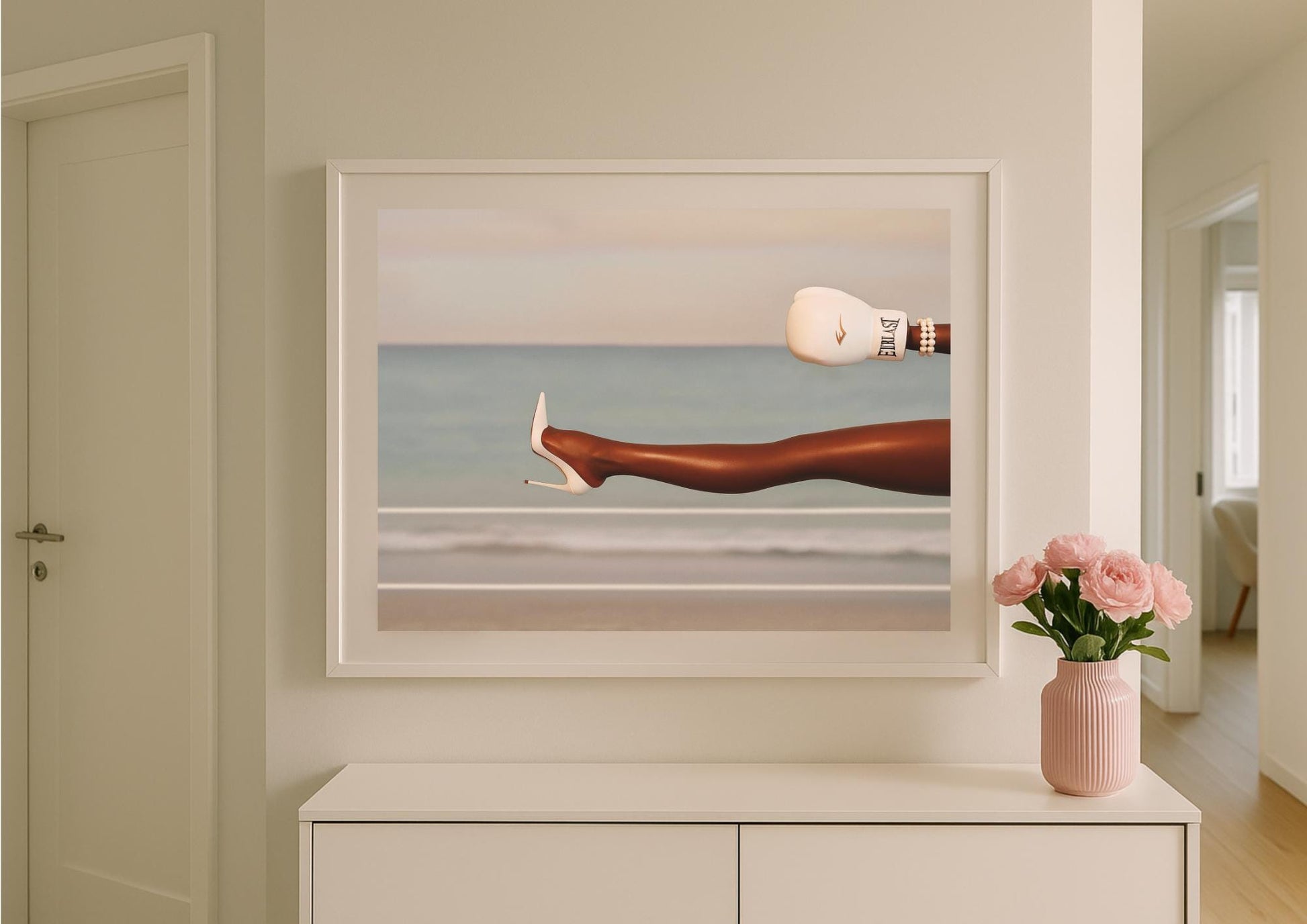 Power meets poise in the Knockout art print — a bold composition that celebrates modern femininity with striking confidence. Featuring an extended leg in sleek stilettos and a boxing glove delivering playful strength, this piece captures the perfect balance of elegance and empowerment.